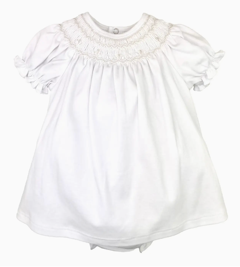 This beautiful bishop smocked knit dress is soft and comfortable, made with 100% cotton this outfit is perfectly soft for baby! Featuring a delicate white interlock knit fabric with bishop smocking on the front making an outfit that is just simply sweet in every way. Matching bloomers are included. The lightweight cotton fabric keeps little ones cool and comfortable and is easy to care for – just machine wash and tumble dry.