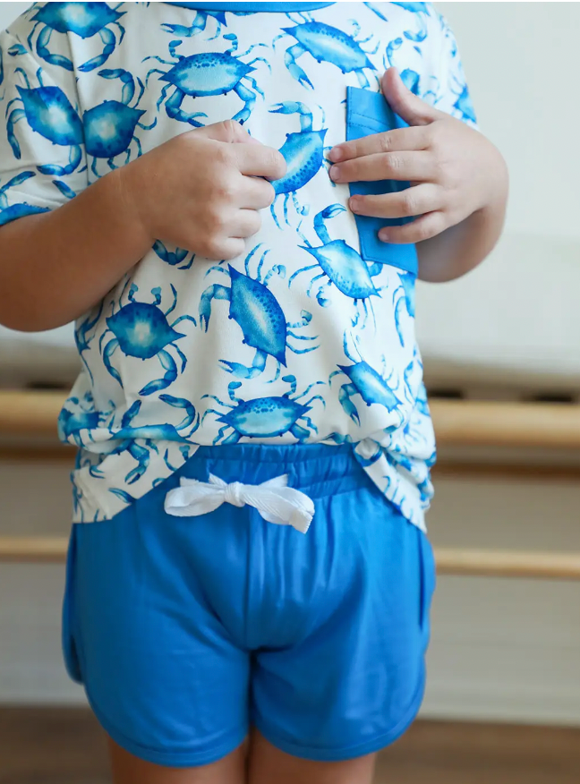 Our Varsity Short Sets make the perfect outfit for littles playing in the heat of a southern summer! This set features a pocket tee and classic varsity shorts with a functional drawstring to ensure a snug fit. Our Blue Crab pattern was created to be a gender neutral classic design that's sure to become a summer staple for your little!