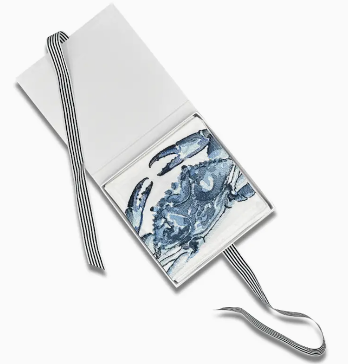 Blue Crab Cocktail Napkin Set Our embroidered Blue Crab Cocktail Napkins feature one of our best selling designs on four linen canvas napkins. Each crab is hand-drawn then beautifully embroidered on the cocktail napkin. DETAILS: Set of four (4) napkins Includes classically styled gift box White/Blue 6" Length x 6" Width x 0.1" Height 100% Linen/Canvas Imported CARE: Wash separately in cool water on a gentle cycle using a mild detergent Gently smooth the edges and lay flat to dry. Can be ironed on a linen setting Spot remover can be used if needed. Do not soak in bleach.