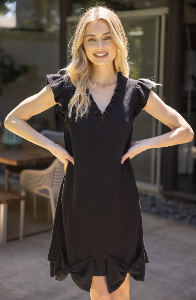 Bow details on hem • Back neck button and elastic loop closure • Short ruffle sleeves • Textured woven shift dress • Model height 5' 8”, wearing size Small