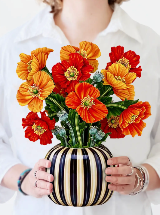 The poppy is a flower that glimmers with hues of tangerine, copper, and ruby reds, representing peace, remembrance, and luxury. This stunning bouquet, elegantly arranged in a stylish striped vessel, is the perfect gift for the unique and creative people in your life. Overflowing with warmth, vibrancy, and meaning, it's sure to leave a lasting impression.
