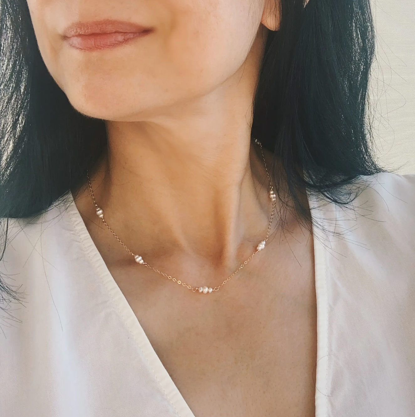 Adorn yourself with a dainty pearl necklace. Two sizes of pearls are used to create a more textured feel. This necklace makes a great gift for bridesmaids. + Pearls. Chain. Spring Ring Clasp. + Length: 16.5 inch.