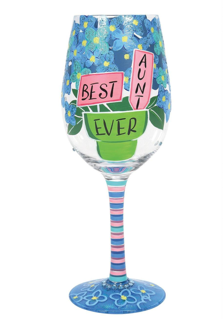 This lovely 15 oz wine glass is a marvel of color and care. This gorgeous glass will serve as a beautiful reminder of love to the special woman in your life. Illuminated in bright flowers, this goblet is the perfect prop for the best aunt ever.