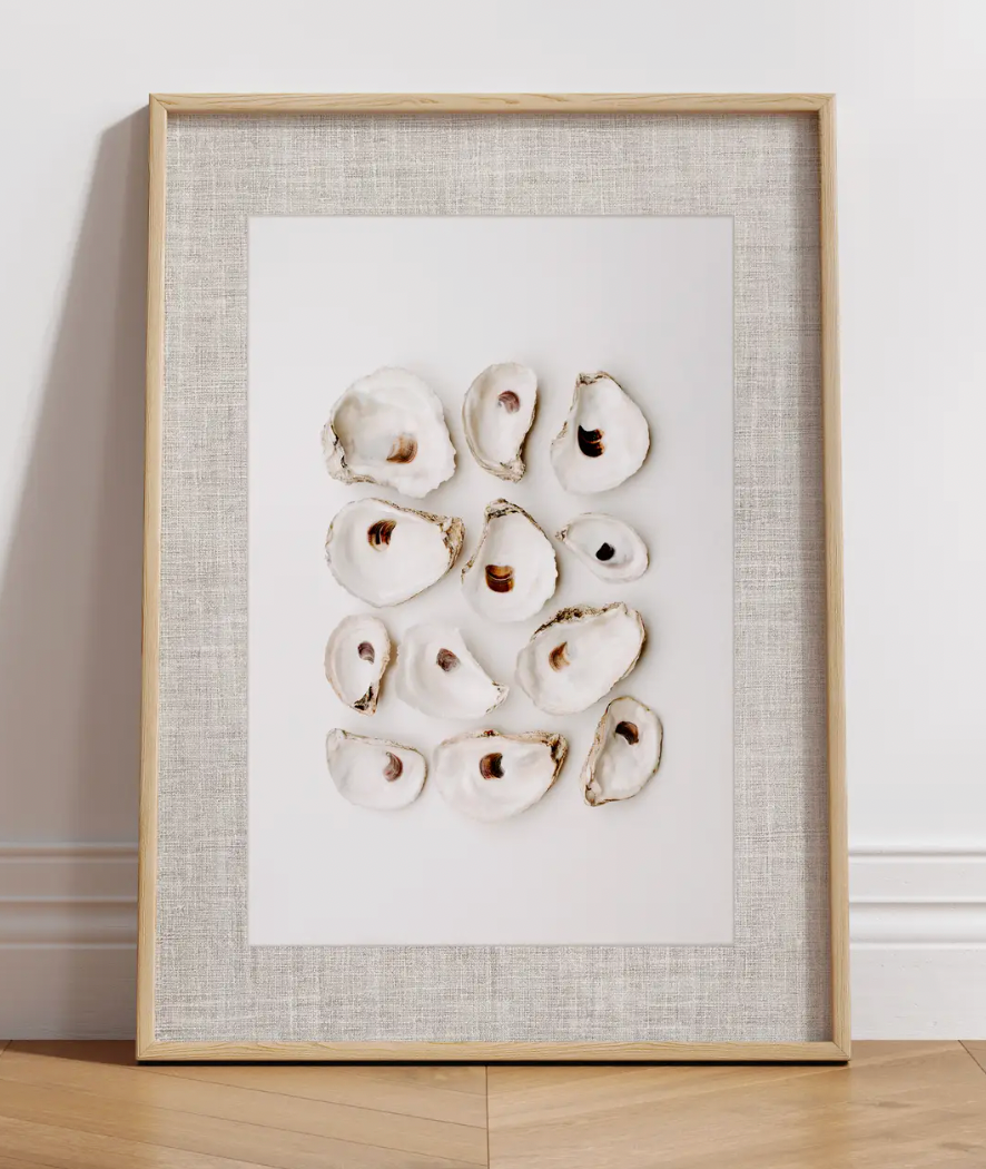 Ready to hang 11x14 framed print of oysters collected right from the Charleston Harbor. Photographed in the Golden Gratitude Studio, waiting to grace the walls of your home. Perfect grab & go gift - all ready to hang! Equipped with shatter proof plexiglass and two metal hangers for horizontal or vertical hanging.