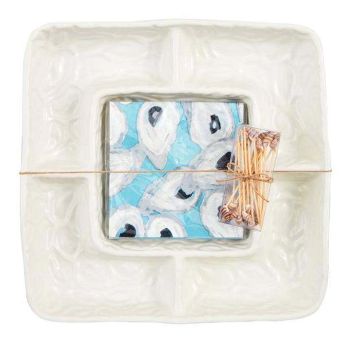 The Oyster Section Server 2-piece set is a chic and functional addition to your dining table. Constructed from textured stoneware, this server is designed with compartments to neatly divide various food items. It also includes a central well to conveniently hold a pack of 12 paper napkins. The server is both dishwasher and microwave safe, ensuring effortless cleaning and reheating of your dishes. Crafted from sturdy stoneware, this server is built to withstand the test of time and brings a touch of sophistication to any dining experience.