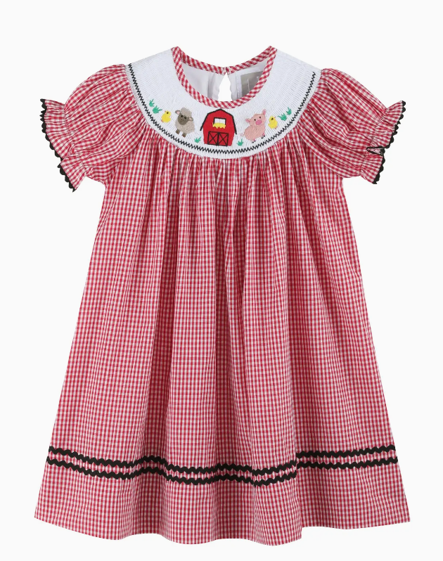 RED GINGHAM BARN ANIMALS SMOCKED BISHOP DRESS