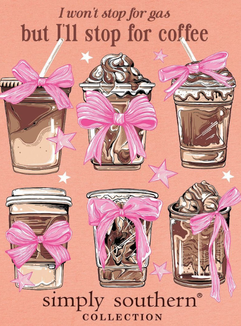 Peach short sleeve shirt with the phrase 'I won't stop for gas but I'll stop for coffee' and an array of different coffees with pink bows. Simply Southern logo below and on left chest. 100% cotton. Unisex sizing.