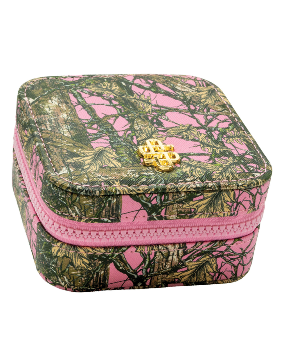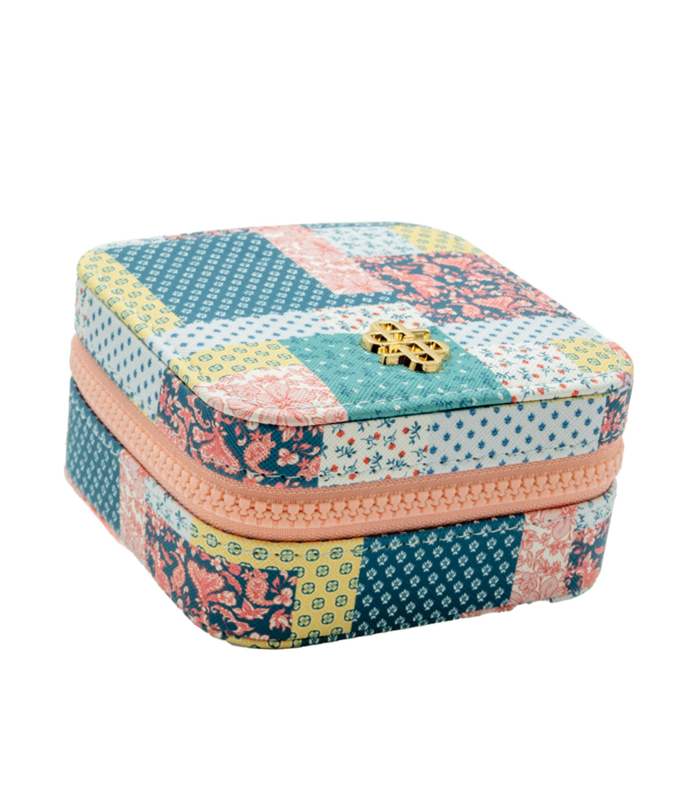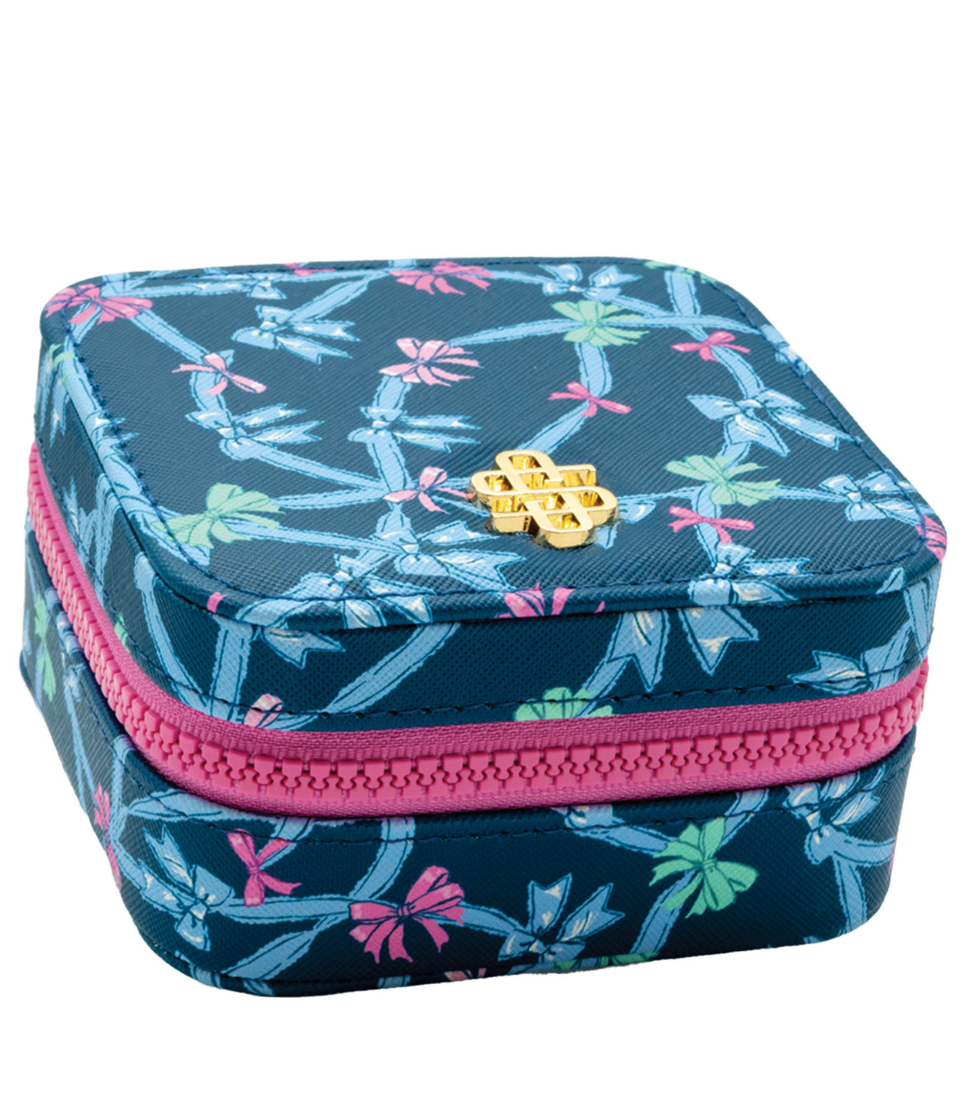 This printed jewelry box is the perfect place to store your jewelry at home or throw in a suitcase for travel. Featuring soft interior, ring, earring, and necklace storage with an interior mirror, gold hardware and Simply Southern logo. Made of 60% PVC 40% polyester.