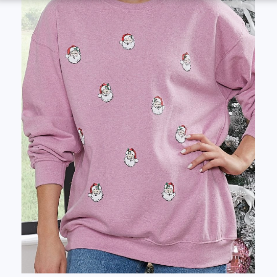 Bubblegum pink long sleeve crew with santas scattered over the front. 55% cotton 45% polyester. Unisex youth sizing