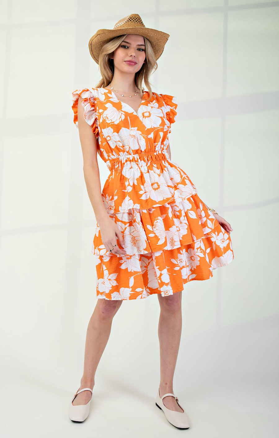 This orange floral dress brings effortless summer charm with its bold white blossom print and easy, flowy silhouette. Designed with a flattering V-neckline and soft flutter sleeves, it cinches gently at the waist for a feminine shape while the tiered skirt adds movement and breezy appeal. Lightweight and comfortable, this dress is perfect for warm days, outdoor gatherings, or weekend getaways. Style it with sandals for a casual look or dress it up with wedges and accessories for a polished daytime outfit.