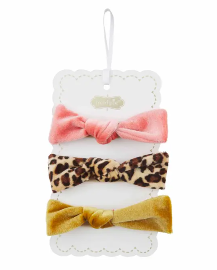 Every little girl needs a our Mustard Velvet Bow Headband set. The set comes with three rolled nylon headbands. Each of the headbands feature a unique coloring and velvet bows on top. This set includes a mustard headband, a pink headband and a leopard print headband. Dimensions 3 1/2" x 6" Material Velvet