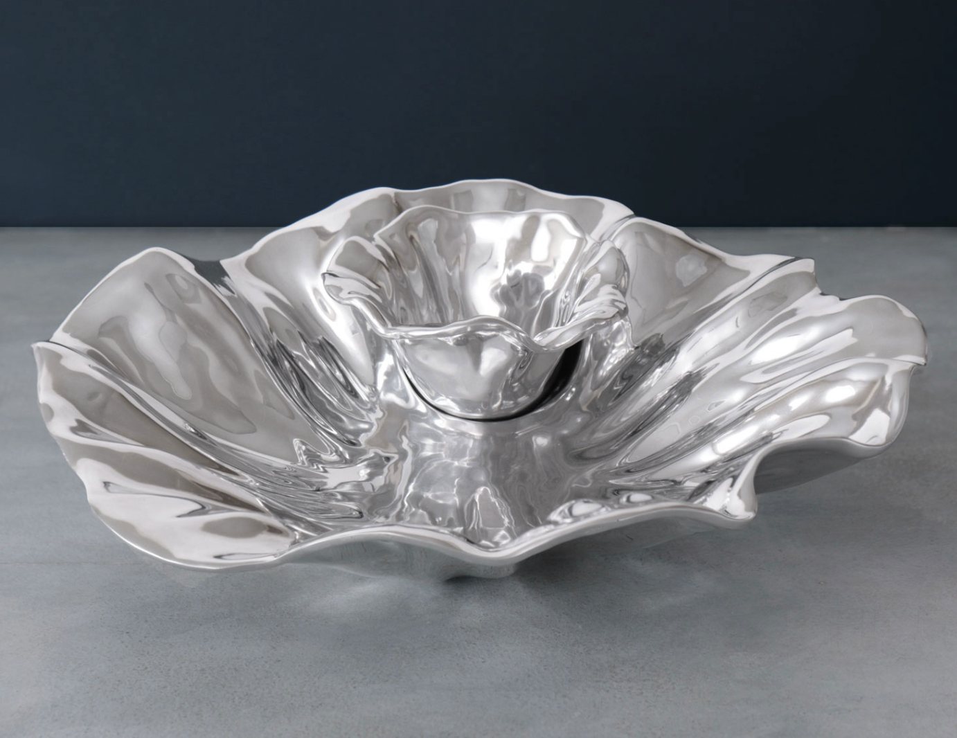 Beauty in Bloom. Designers Beatriz Ball and Gretchen Murchison share a desire to create pieces that are beautiful as well as functional. That's why we've collaborated with the like-minded Louisiana-based ceramicist on the vibrant Bloom Collection. Rendered in the company’s signature sand-cast metal, in luxury melamine, and in acrylic, the Bloom Collection comprises sculptural bowls, platters and more inspired by floral and botanical forms. As with the other Bloom pieces, the dynamic design of the two-part VENTO Bloom Chip and Dip in our signature hand-polished metal features rippling petal-like movement, creating an eye-catching serving piece that combines beauty, artistry and functionality. Great on its own, or combined with other Bloom shapes and sizes, this handsome chip and dip will be the life of the party. The dip bowl is easily removable and may be used on its own. Beatriz Ball’s intensely handmade products use eco-friendly and sustainable materials and are crafted by artisans who trace a heritage of metalworking for generations. Made of a top quality, FDA safe, easy-care friendly aluminum alloy.