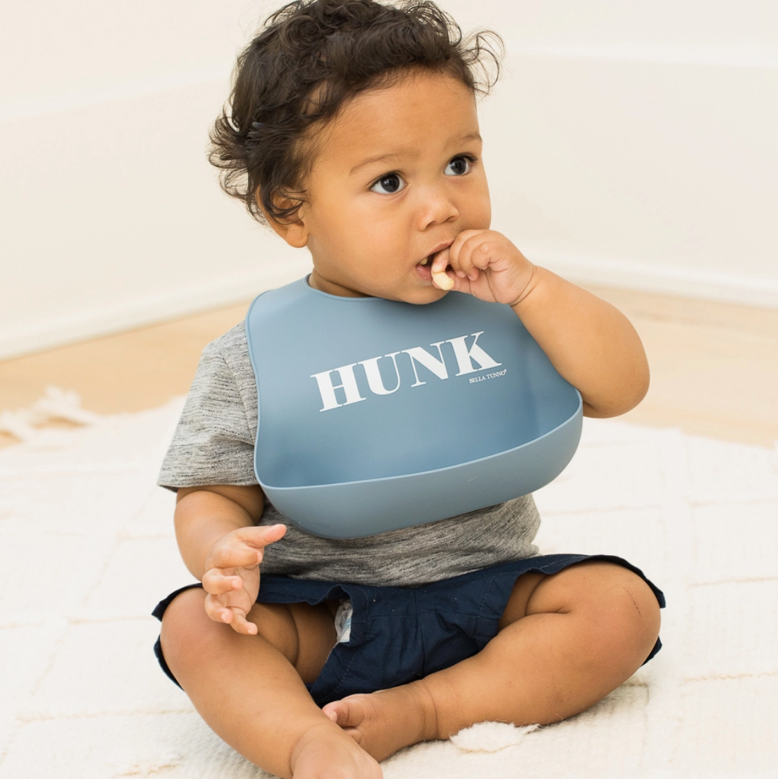silicone bib with adjustable neck and mobile snack pouch will become your go-to for every meal. Soft, pliable design. Waterproof. Adjustable Neck. Folds for Travel. Catch Pocket Depth: Sits at 1.5”. Size: 8" x 11.25". Recommended Age: 6 months+. Wipe clean with soap and water. Dishwasher Safe. 100% Food Grade, FDA approved silicone.